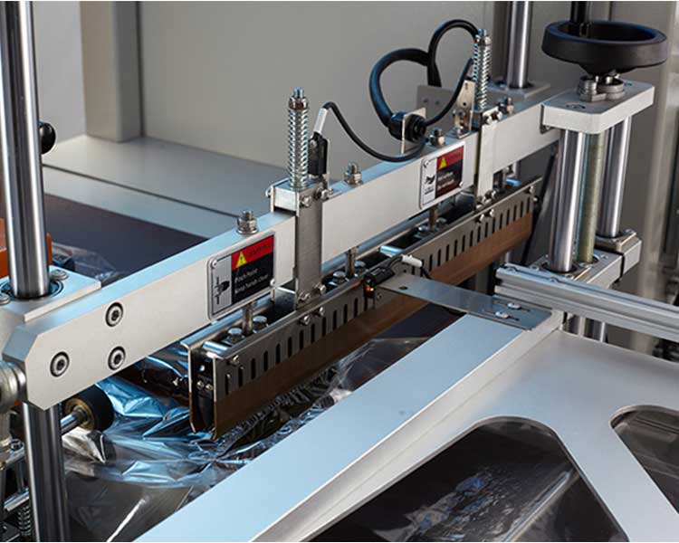 自主調(diào)節(jié)高度 封口高度可調(diào)整,當包裝物尺寸變更時,通過手輪轉(zhuǎn)動調(diào)節(jié)包裝尺寸,調(diào)整非常簡單,不 用換模具與制袋器;